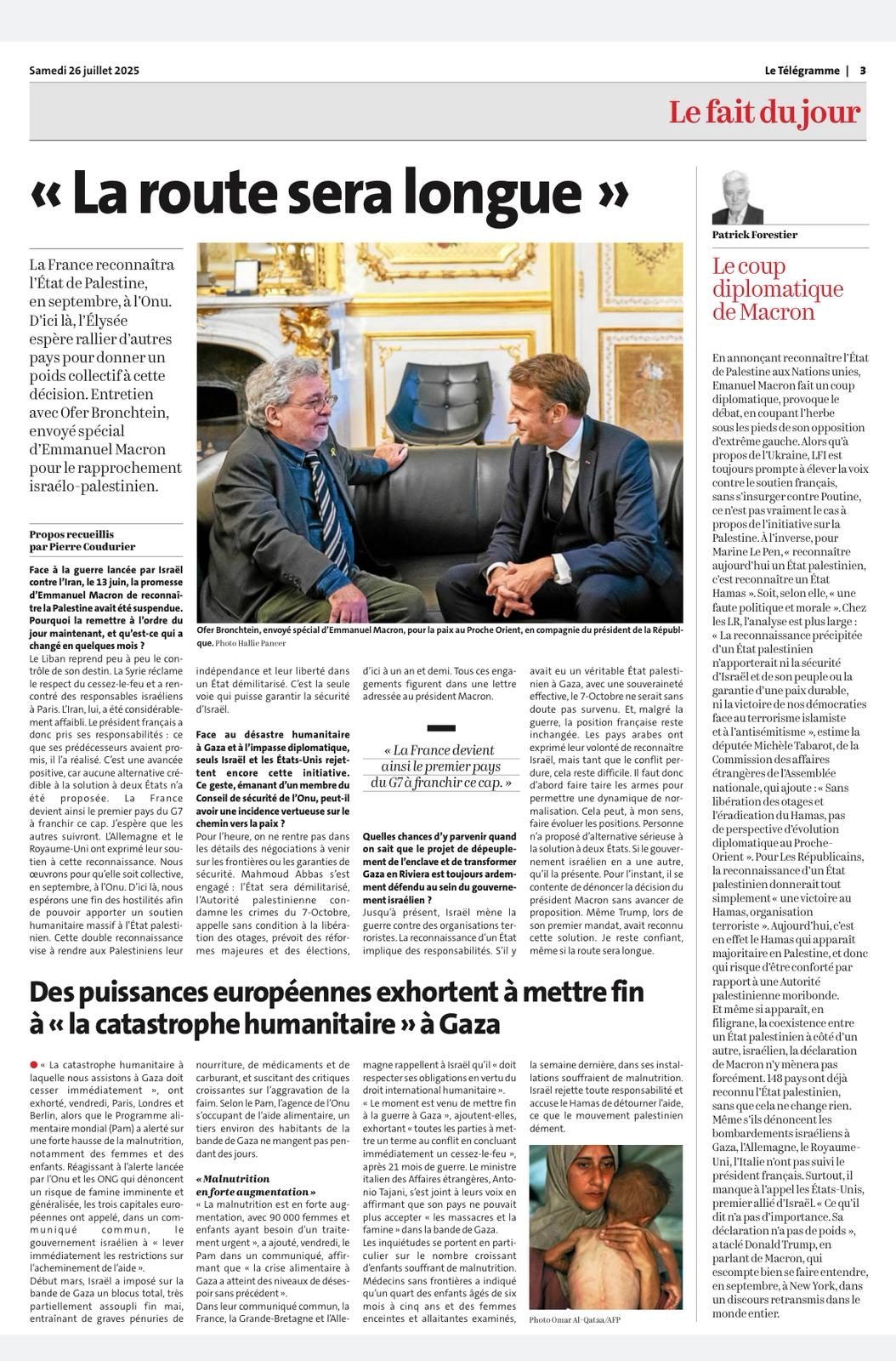 Retrouvez l’entretien d’Ofer Bronchtein, envoyé spécial chargé du rapprochement israélo-palestinien, dans Le Télégramme, après l’annonce par Emmanuel Macron de la reconnaissance de l’État de Palestine en septembre à l’ONU.